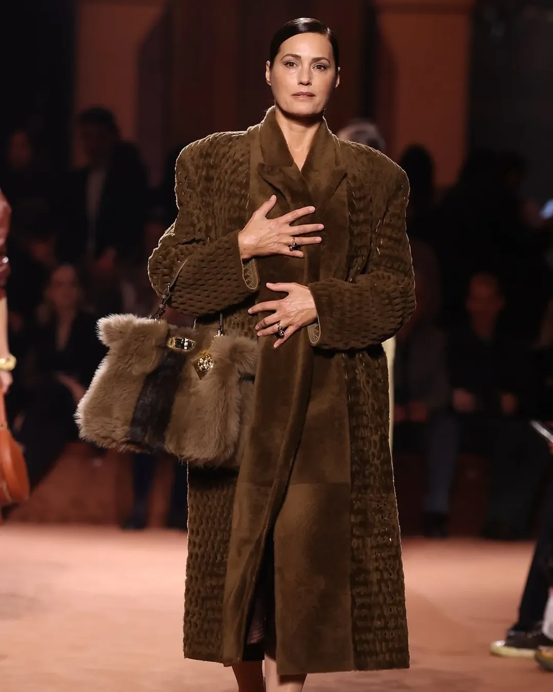 The collection drew inspiration from Fendi’s storied past, featuring luxurious materials and intricate designs reminiscent of the 1960s and 1970s. Notable pieces included shearling coats crafted to mimic traditional furs through advanced techniques, and garments adorned with crystals, paillettes, chantilly lace, and pleated taffeta, reflecting the brand’s commitment to exquisite craftsmanship.