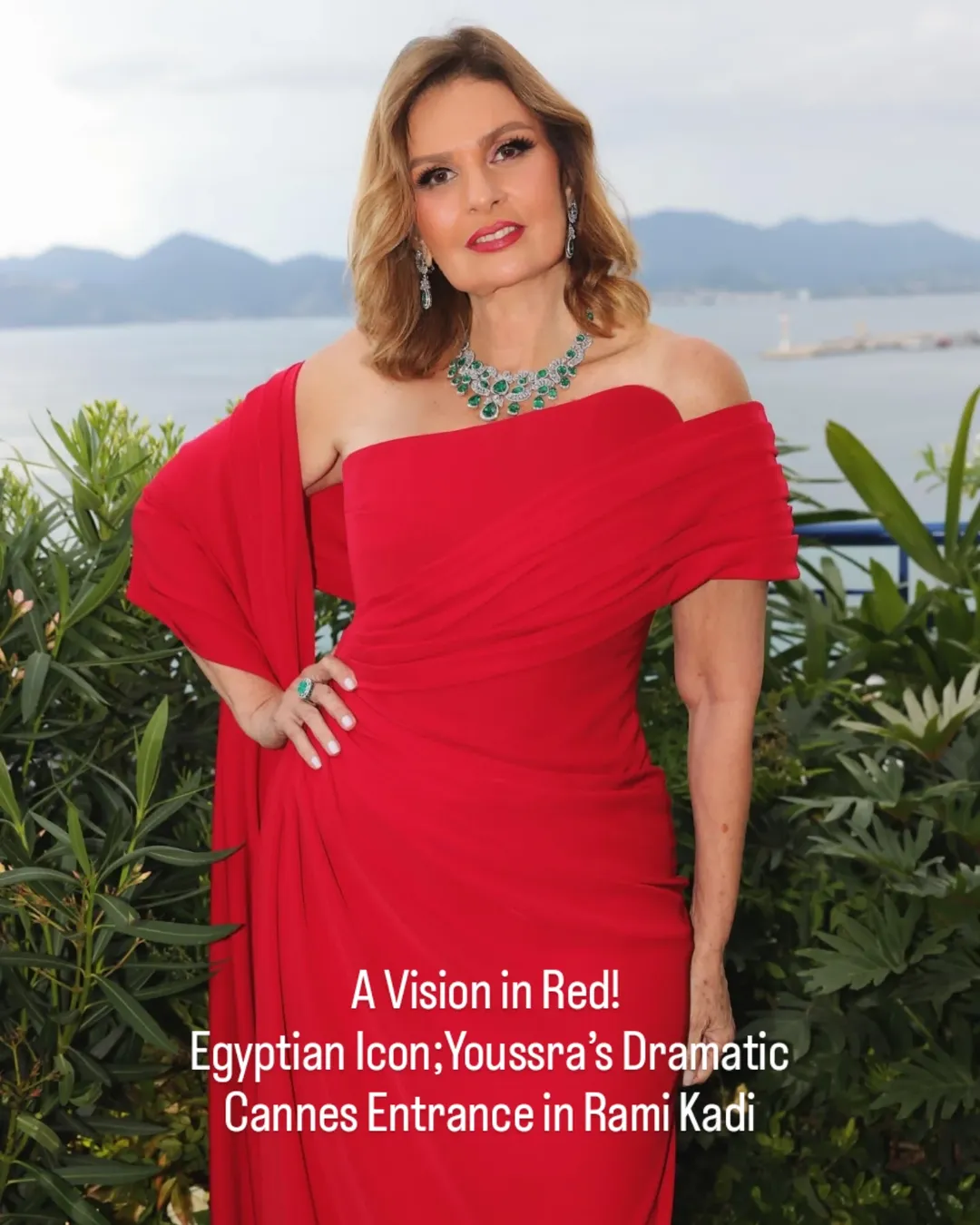 Egyptian screen legend Youssra brought unapologetic elegance to the Cannes 2025 red carpet, captivating attendees in a show-stopping flame scarlet gown by Rami Kadi. The custom masterpiece, defined by its asymmetric lines and fluid draping across the bodice and arm, delivered a silhouette that was both daring and effortlessly graceful — a striking blend of classic poise and modern couture drama.