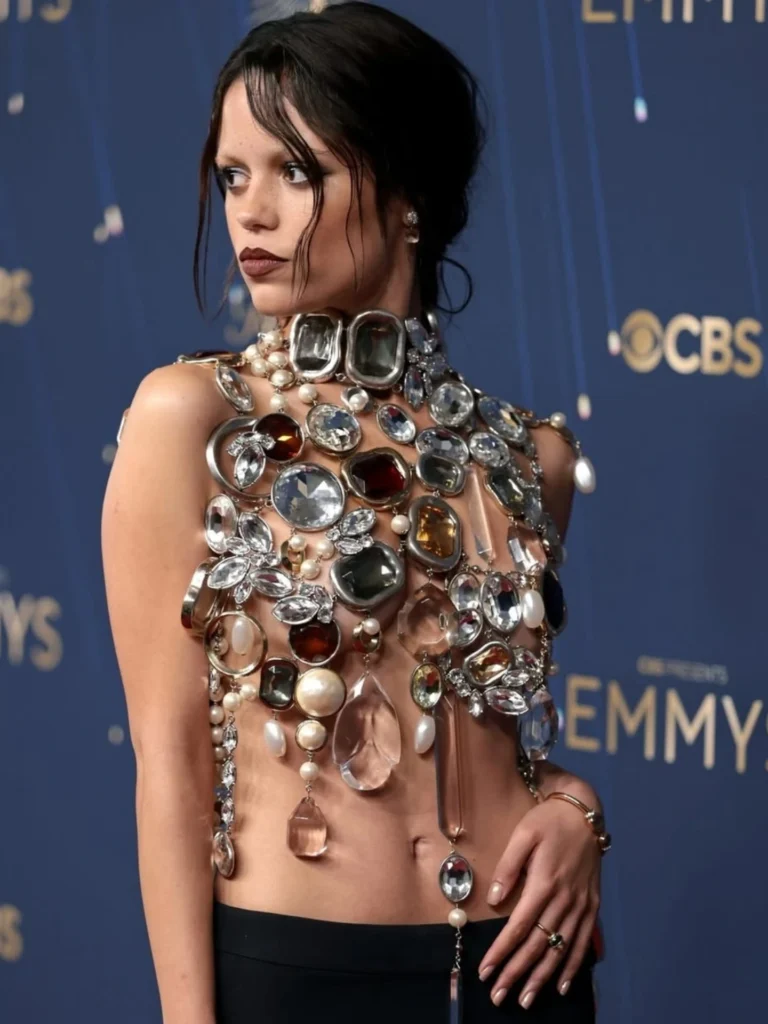 When jewels become the top: Jenna Ortega stunned at the Emmys in a gemstone-top and slit skirt from Givenchy.